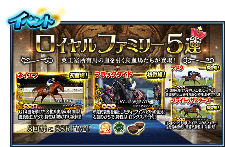 StarHorse4運営チームです。 2025年10月24日(金)15:00より「ロイヤルファミリー5連」が開始されます! 【開催期間】 2025年10月24日(金)15:00 ~ 2025年11月16日(日)26:00 … 続きを読む