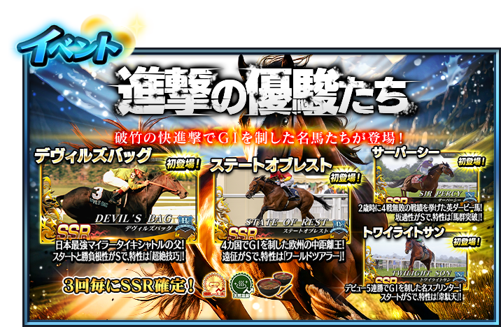 StarHorse4運営チームです。 2026年1月16日(金)15:00より「進撃の優駿たち」が開始されます! 【開催期間】 2026年1月16日(金)15:00 ~ 2月15日(日)26:00 【目玉スターホースカー … 続きを読む